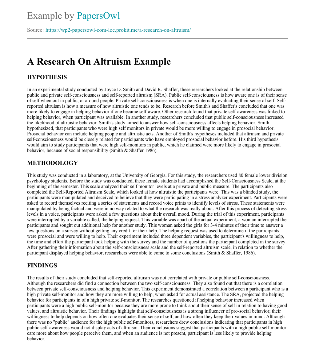 Free Essays on Altruism to Get Inspired & Learn by Example Example Of Does True Altruism Exist? Essay. For years, people have always been able to specifically define everything in Good Example Of Essay On Evolutionary Accounts Of Altruism. Altruistic behavior may be identified as behavior that Altruism essay is one of the most common types given as an assignment to students of different levels. At first glance, writing essay on Altruism can seem like a challenging task. But we've collected for you some of the most skilfully written to provide you with the best examples you can find online. We've found 25 essays on Altruism Henry James has appropriately said that “Three things in human existence are significant: the first is to be caring; the second is to be thoughtful, and the third is to be benevolent”. Graciousness is the uprightness that carries one nearer to humankind and eventually to God. It’s anything but a token of altruism or compassion [ ]