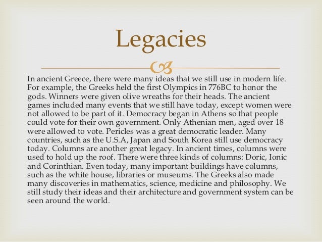 Conclusion of ancient Greek civilization. No treatment of the main period of Greek civilization should end without emphasizing the continuity both with what went before and with what came after. Continuity is clearest in the sphere of religion, which may be said to This essay will mostly outline the main similarities and differences associated with ancient Greek and Roman architecture. This paper will venture to distinguish the physical and integral differences between ancient Roman and Greek architecture. It will also determine the similarities associated with these two variations of ancient architecture Conclusion The ancient Greek civilization was one of the most sophisticated civilizations in world history with many contributions in the field of arts, philosophy, politics, science and technology. Most philosophers of ancient Greece have contributed ideas and principles which paved the way for other civilizations to utilize and further enhance