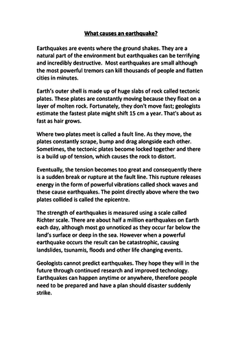 · In your earthquake essay, you might want to compare and contrast various types of this natural disaster. Another option is to talk about your personal experience or discuss the causes and effects of earthquakes. In a more serious assignment like a thesis or a term paper, you can concentrate on earthquake engineering or disaster management issues Earthquakes can range in size from those that are so weak that they cannot be felt to those violent enough to toss people around and destroy whole cities. The seismicity, or seismic activity, of an area is the frequency, type and size of earthquakes experienced over Earthquake Geology Analysis of the Earthquakes Words • Pages • 3 Earthquakes are regarded as one of the deadliest natural disasters. Huge damage and loss of property are caused by earthquakes. There are various types of earthquakes. Some of them are severe in nature. The most dangerous thing about an earthquake is that it is quite unpredictable. It can cause several damages without any previous indication